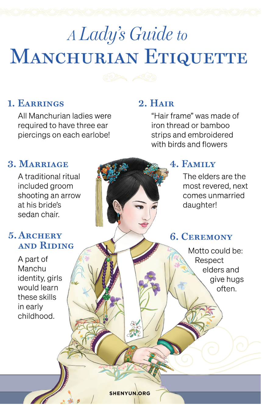 Do đó, lần tới nếu như bạn du hành thời gian trở về thế kỷ 17, hay có dịp thưởng thức tiết mục của Shen Yun, bạn nhớ quan sát thật kỹ những đôi hoa tai, những bộ khung vấn tóc được làm công phu tinh xảo, cùng những bước chân xinh xắn trên đôi giày hoa bồn với tư thế hoàn hảo nhé. Có lẽ bạn sẽ không thấy [người ta trao nhau] nhiều cái ôm, tuy nhiên chúng ta có thể dễ dàng đón nhận không khí trang nghiêm và lễ nghi của một vương triều cổ xưa.