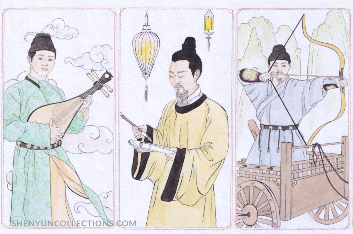 Khổng Tử, dựa trên Chu Lễ, đã đặt ra tiêu chuẩn tu dưỡng kỹ năng của bậc nho sinh với Lục Nghệ - Lễ, Nhạc, Xạ (bắn cung), Ngự (cưỡi xe, điều khiển ngựa), Thư (viết chữ), và Số (tính toán). Hệ thống giáo dục cổ đại này của Trung Hoa đã có ảnh hưởng sâu rộng đến toàn bộ khu vực châu Á, đặc biệt là nền giáo dục truyền thống của Nhật Bản và Hàn Quốc. Tiết mục “Múa cổ điển nam” của Shen Yun chính là thể hiện khí chất văn võ song toàn của các nho sinh xưa.